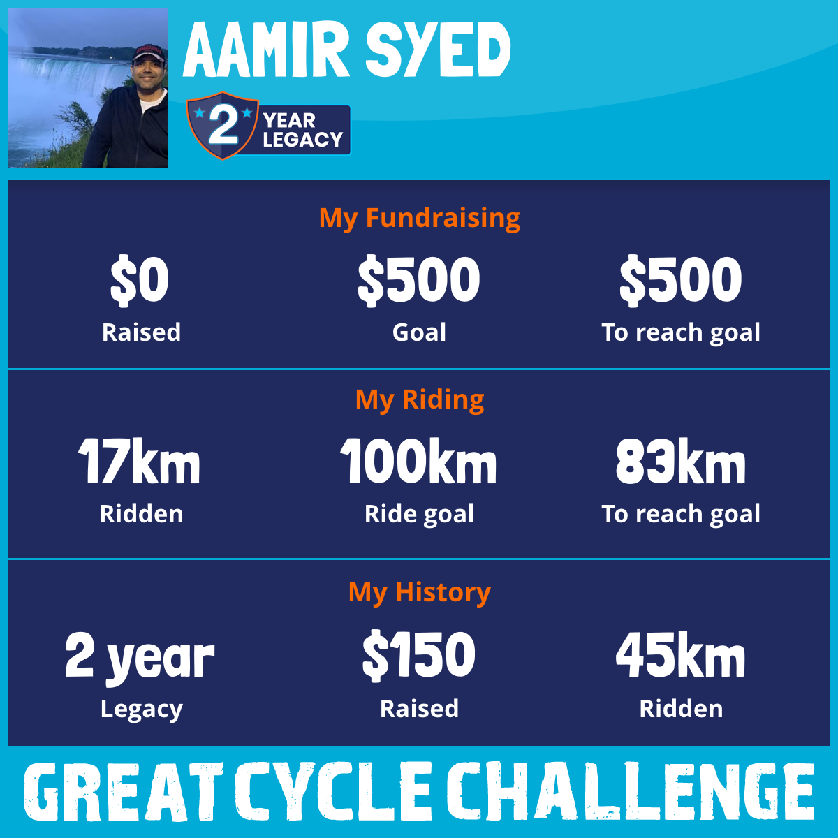 I am riding 100 km in memory of my aunty, Qaiser. Please sponsor me and support my challenge to fight kids' cancer and save little lives.