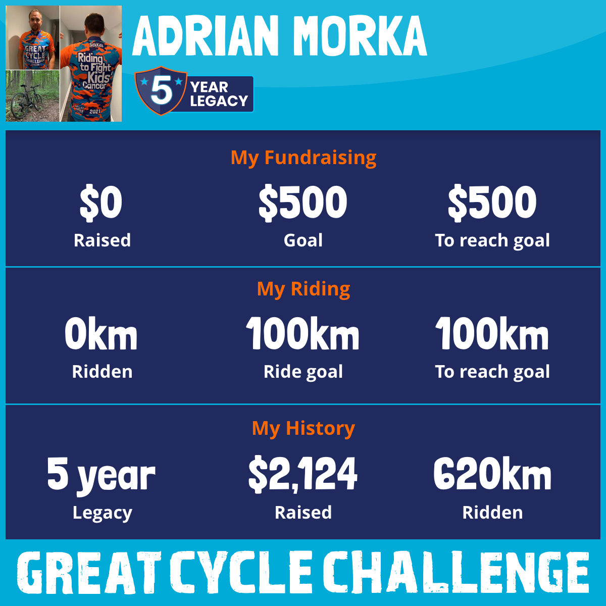 My hope is to raise awareness about childhood cancer and the importance of support, strength and courage during the cancer journey. This August 2022, I am participating in the Great Cycle Challenge - Ride to Fight Kids Cancer to support Sick Kids Foundation to continue to do the wonderful work they do in efforts to find better treatments and improve quality of care.