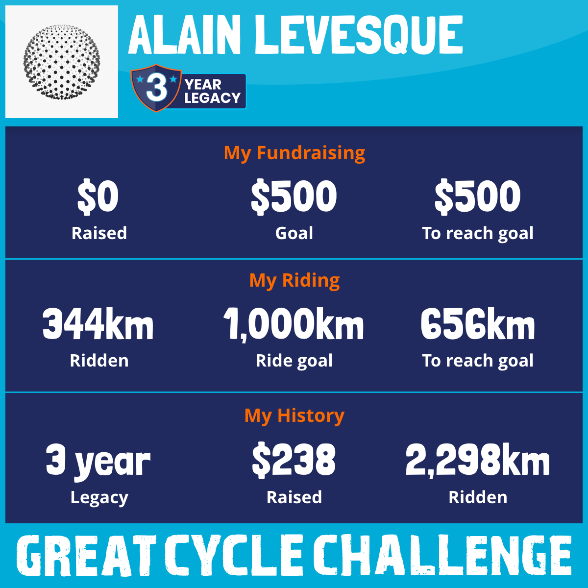 I am riding 1,000 km in memory of my dad, my father, Patrice Levesque. Please sponsor me and support my challenge to fight kids' cancer and save little lives.