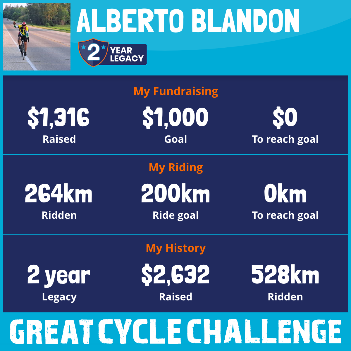 264 km Ridden$1,316 Raised2026