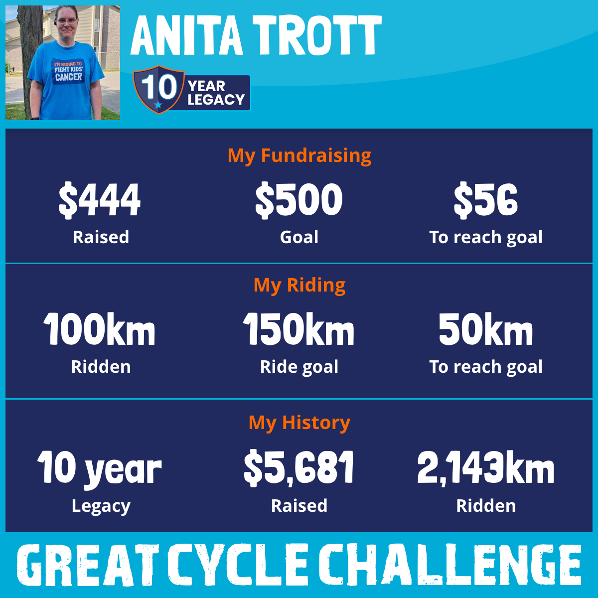 9th Year! I'm riding again this August, taking part in the Great Cycle Challenge to fight kids' cancer!