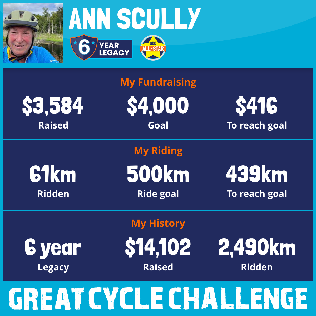 I am riding 500 km in memory of Leslie, Andrea, Kathy P, Margaret-Anne G. Please sponsor me and support my challenge to fight kids' cancer and save little lives.