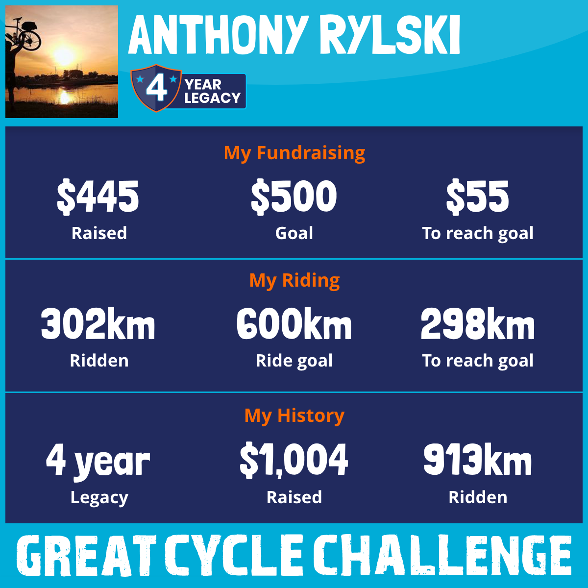 I would like to ask you to consider supporting me and my team in our goal to raise $600 and ride 850Kms.