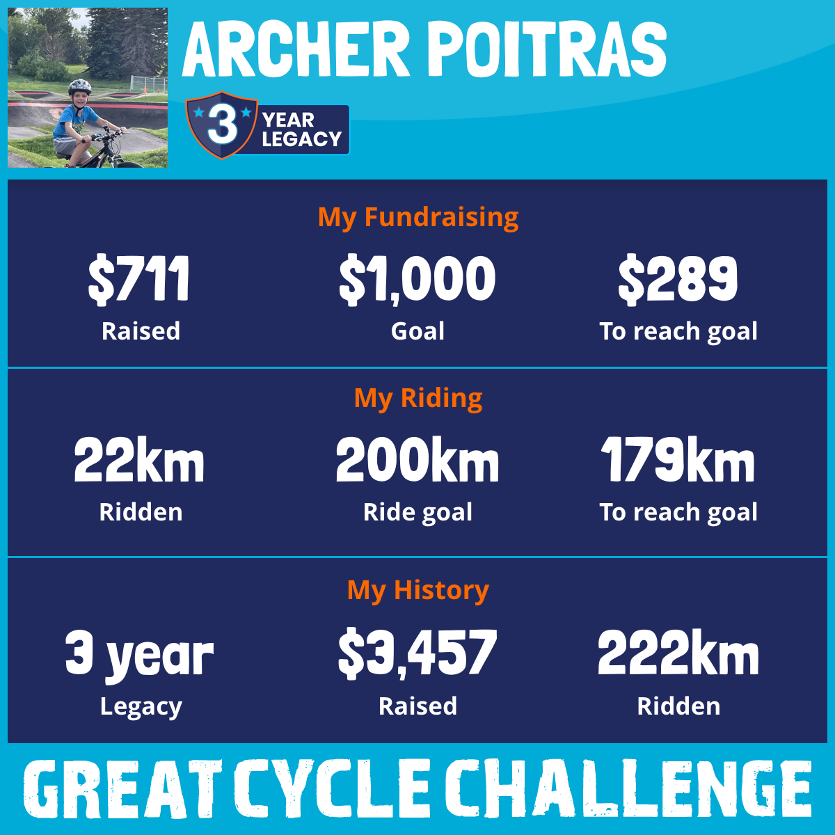 I am riding 100 km in memory of Grandpa Poitras. Please sponsor me and support my challenge to fight kids' cancer and save little lives.