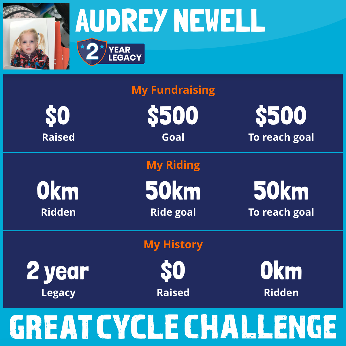 I am riding 50 km in memory of my friend, Colleen. Please sponsor me and support my challenge to fight kids' cancer and save little lives.
