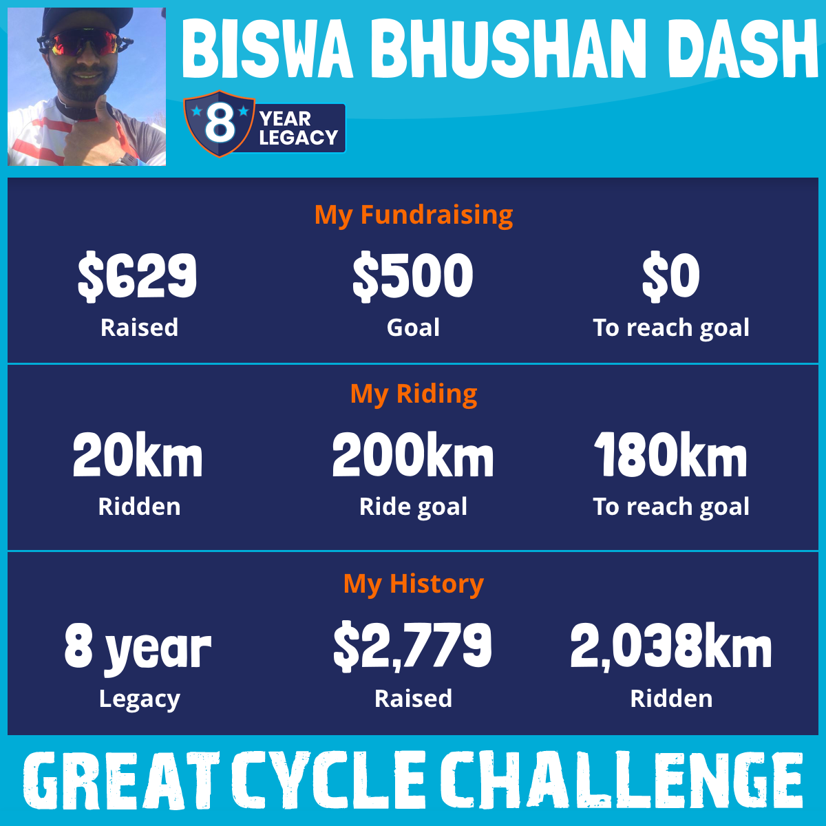 “Biswa is cycling for a great cause. I am donating to support his cause and efforts. Good luck Biswa for your endeavors and keep it up !!!”