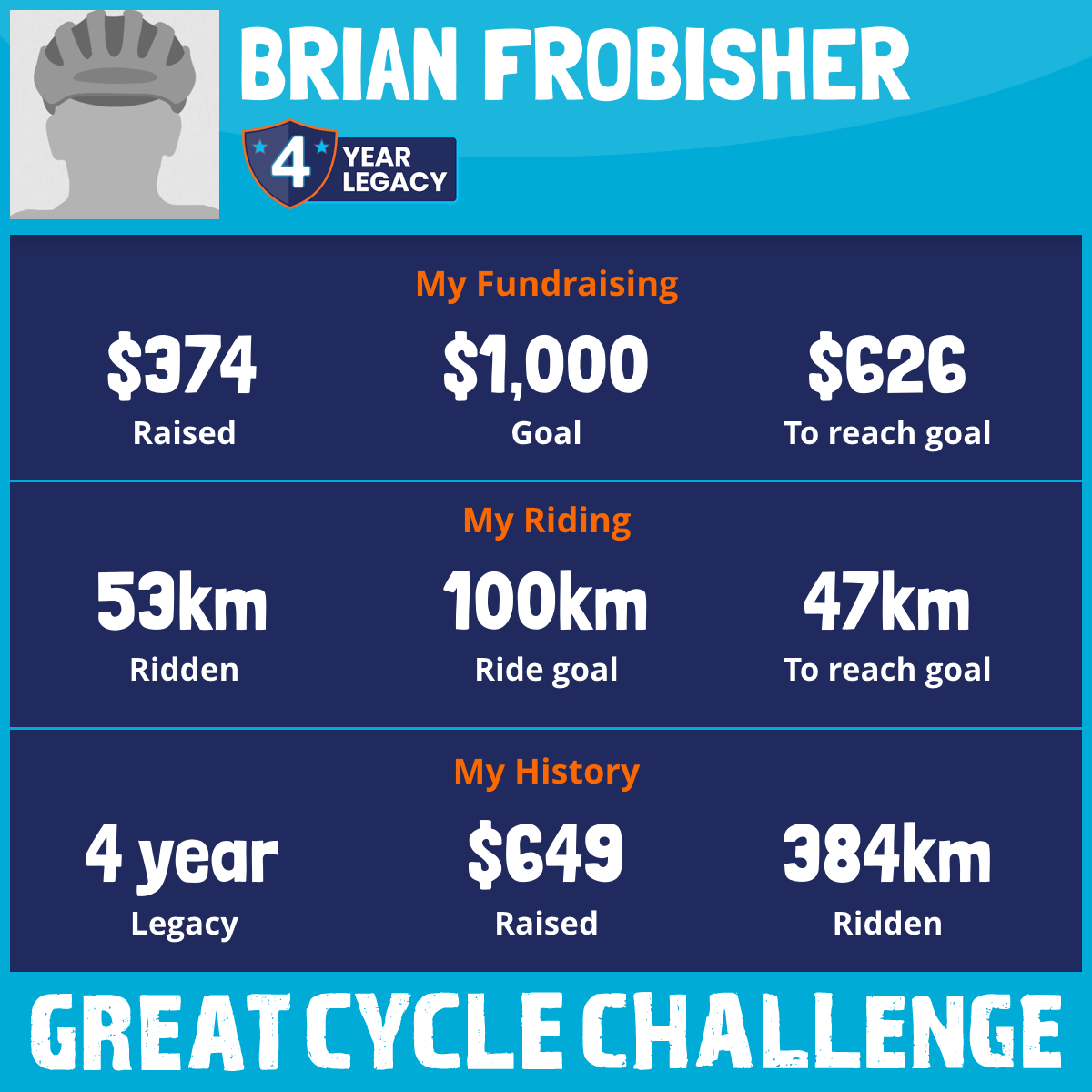 I am riding 100 km for my dad, Doug Frobisher. Please sponsor me and support my challenge to fight kids' cancer and save little lives.