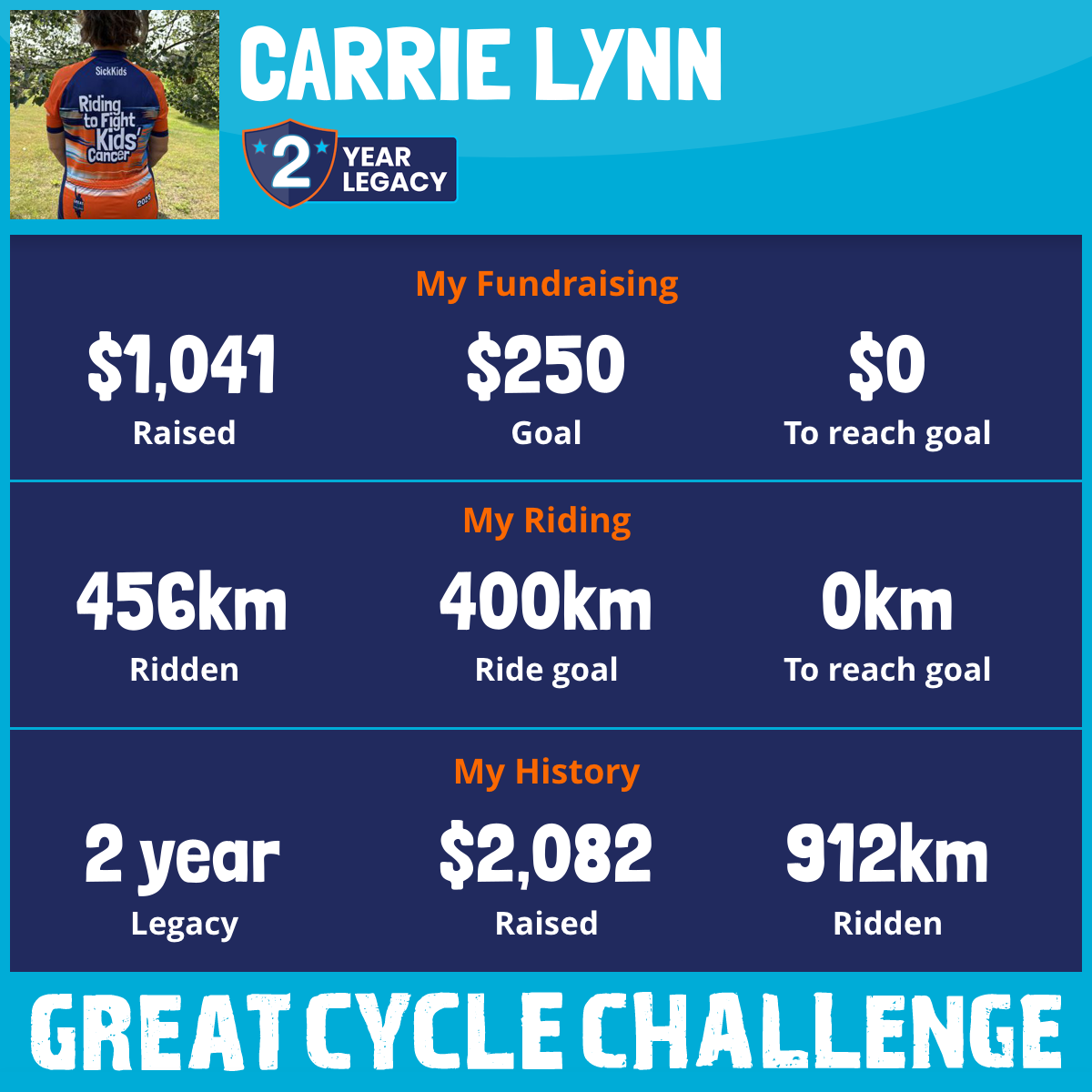 456 km Ridden$1,041 Raised2026