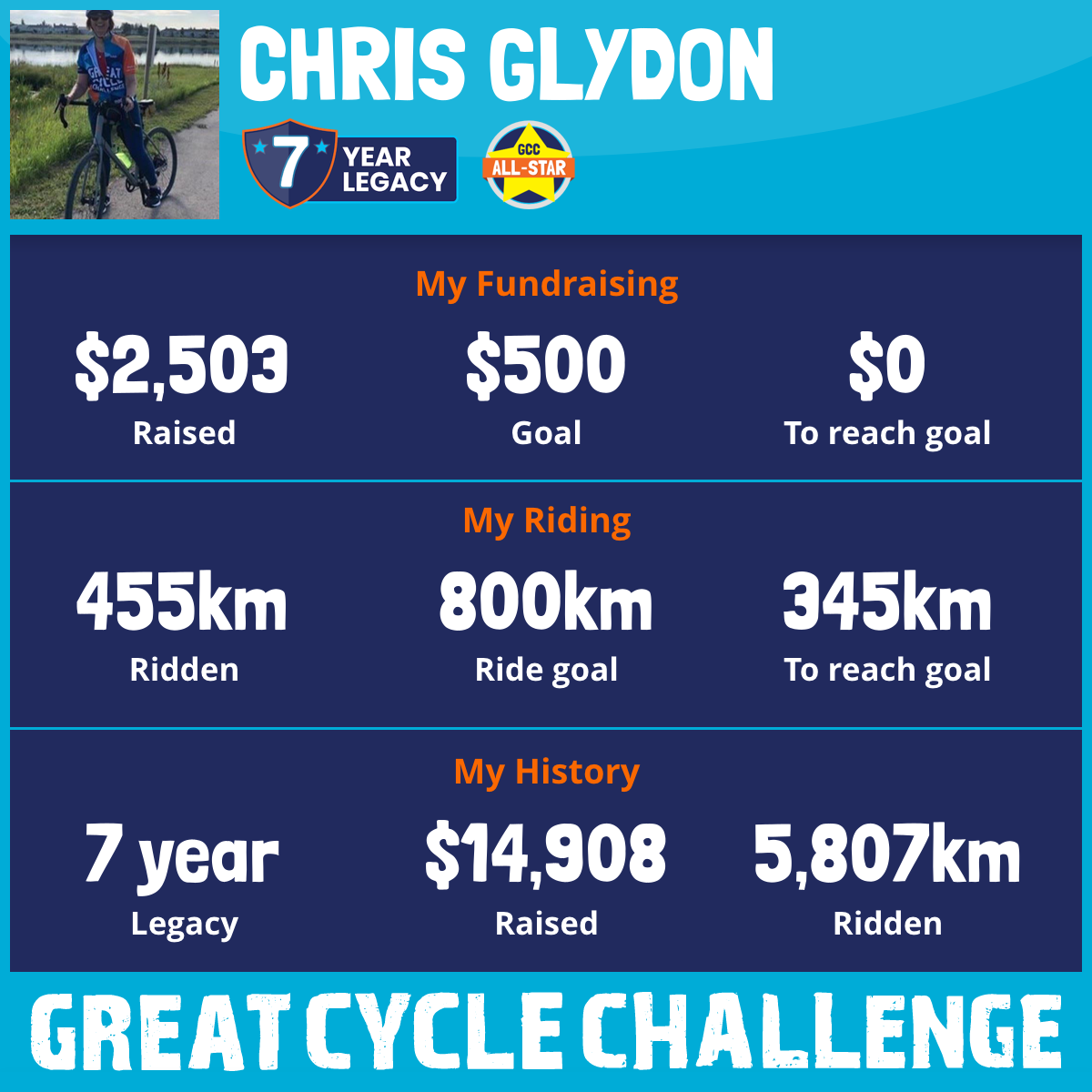 1,060 km Ridden$2,504 Raised2022