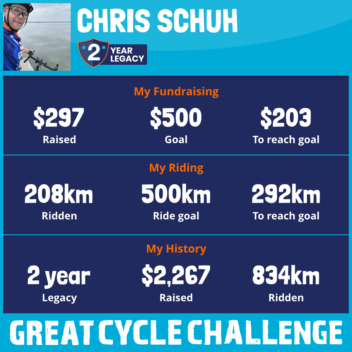 In 2024 I rode the Great Cycle Challenge on my own. This year in 2025 we have a team. Allison, Ember, Nicholas, Parker, Aunty Tracy and I are all riding together as Team Schuh’s.