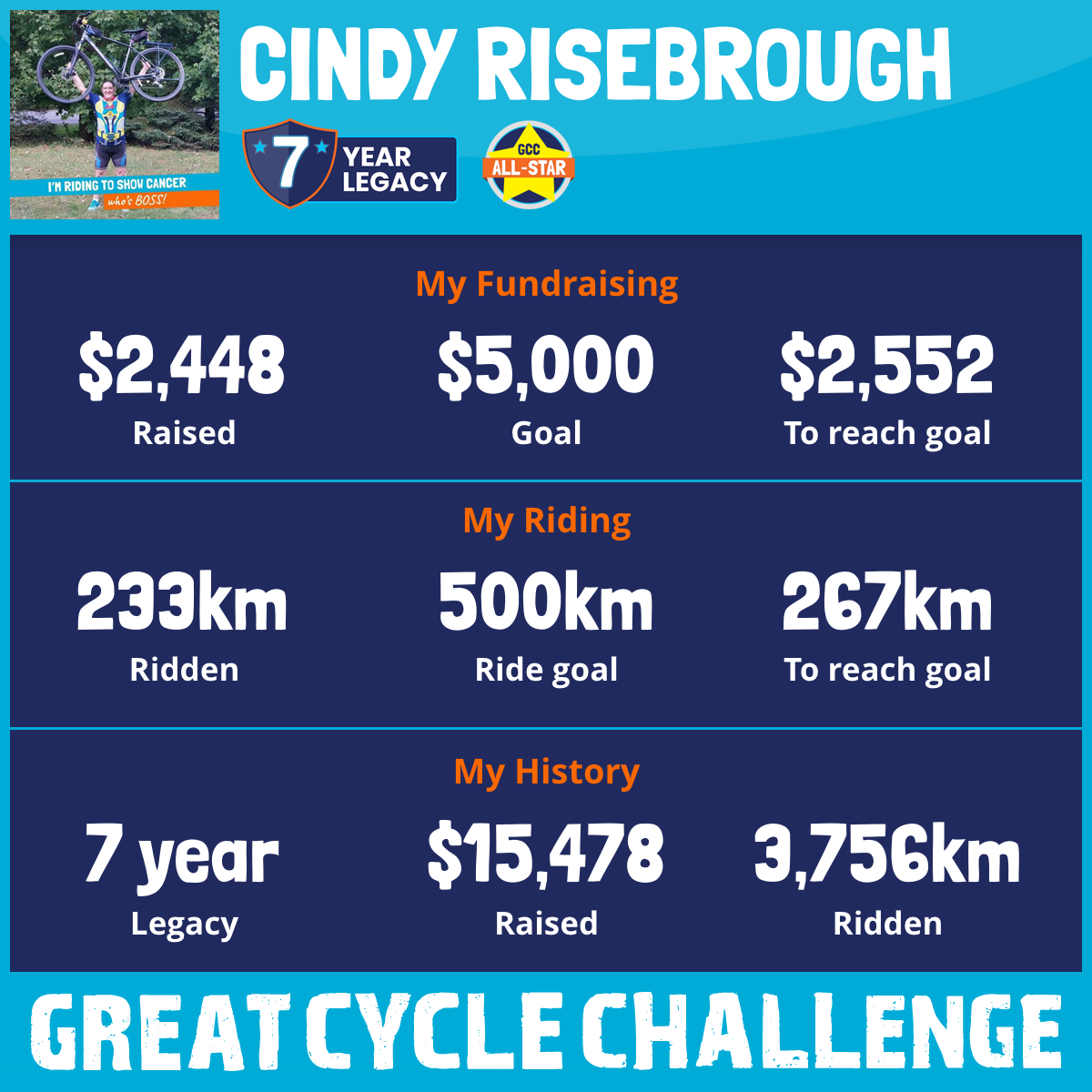 805 km Ridden$2,914 Raised2024