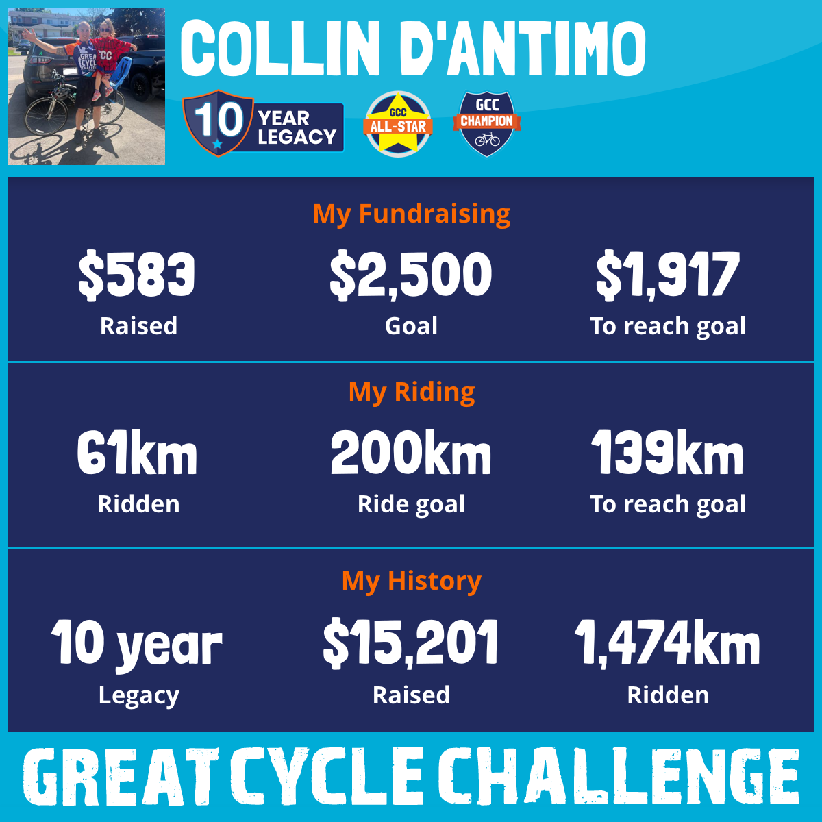 185 km Ridden$1,850 Raised2023