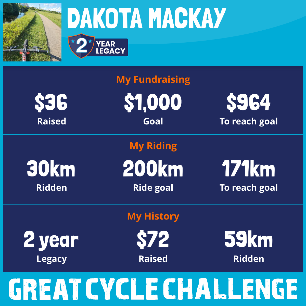 I am riding 200 km for Dawn Mackay. Please sponsor me and support my challenge to fight kids' cancer and save little lives.