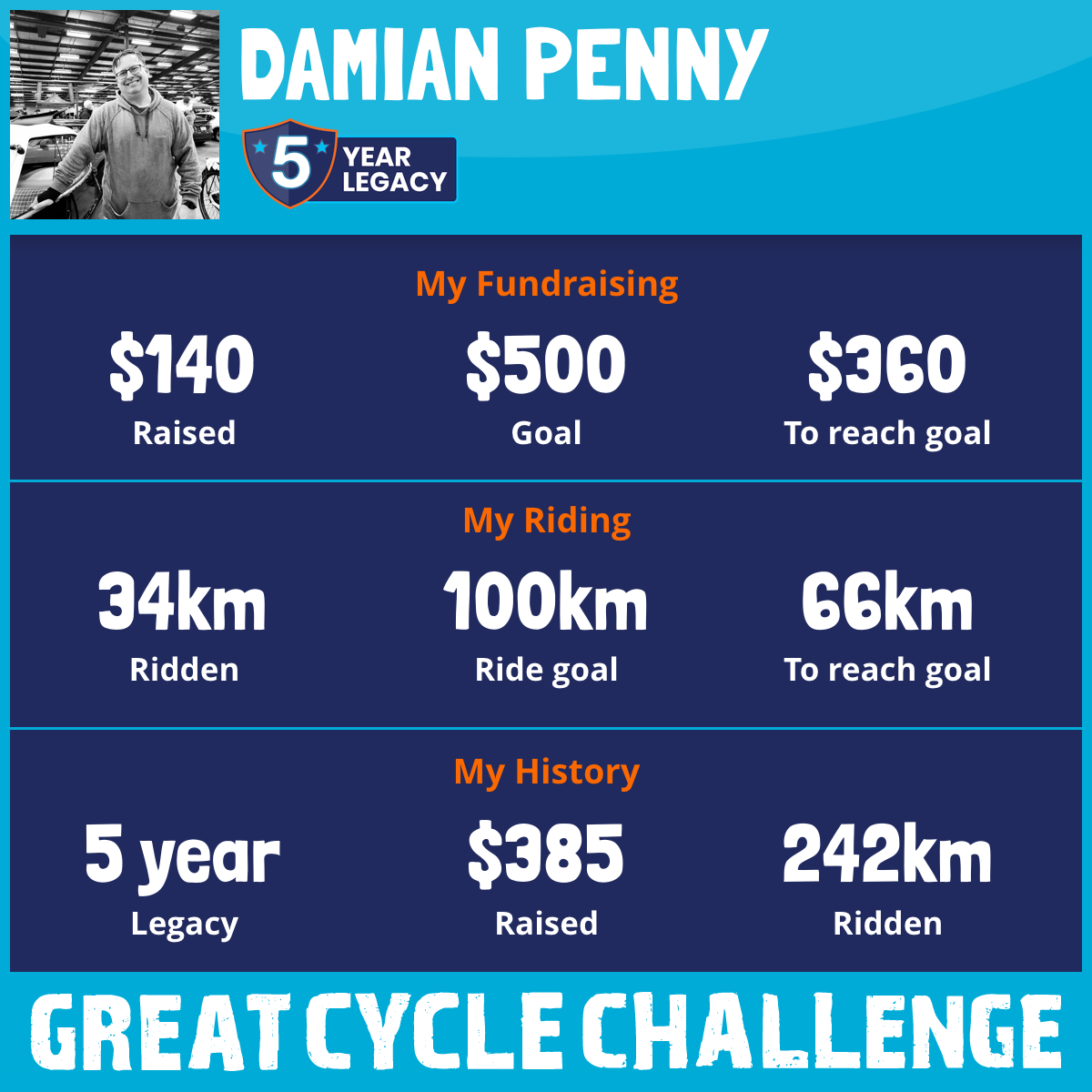 I am riding 100 km for Dave Penny. Please sponsor me and support my challenge to fight kids' cancer and save little lives.