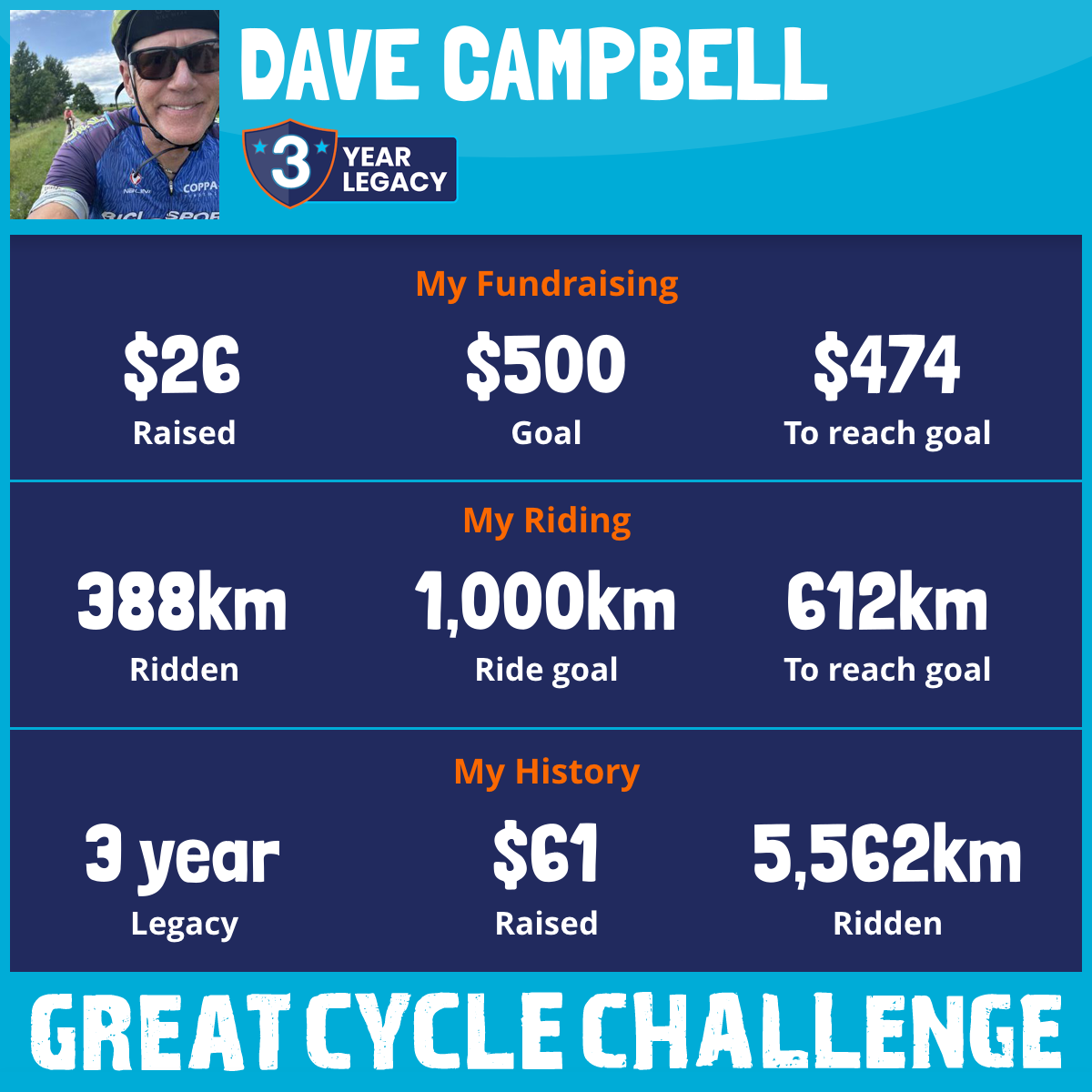I am riding 1,000 km in memory of my brother, Ken Campbell. Please sponsor me and support my challenge to fight kids' cancer and save little lives.