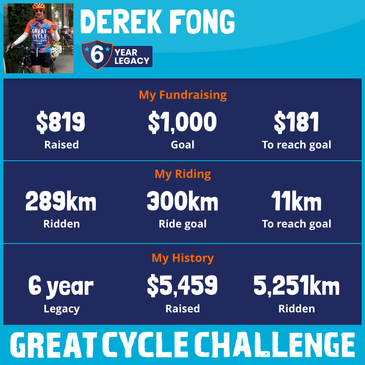 I am riding 300 km in memory of my loved one, Derek Fong. Please sponsor me and support my challenge to fight kids' cancer and save little lives.
