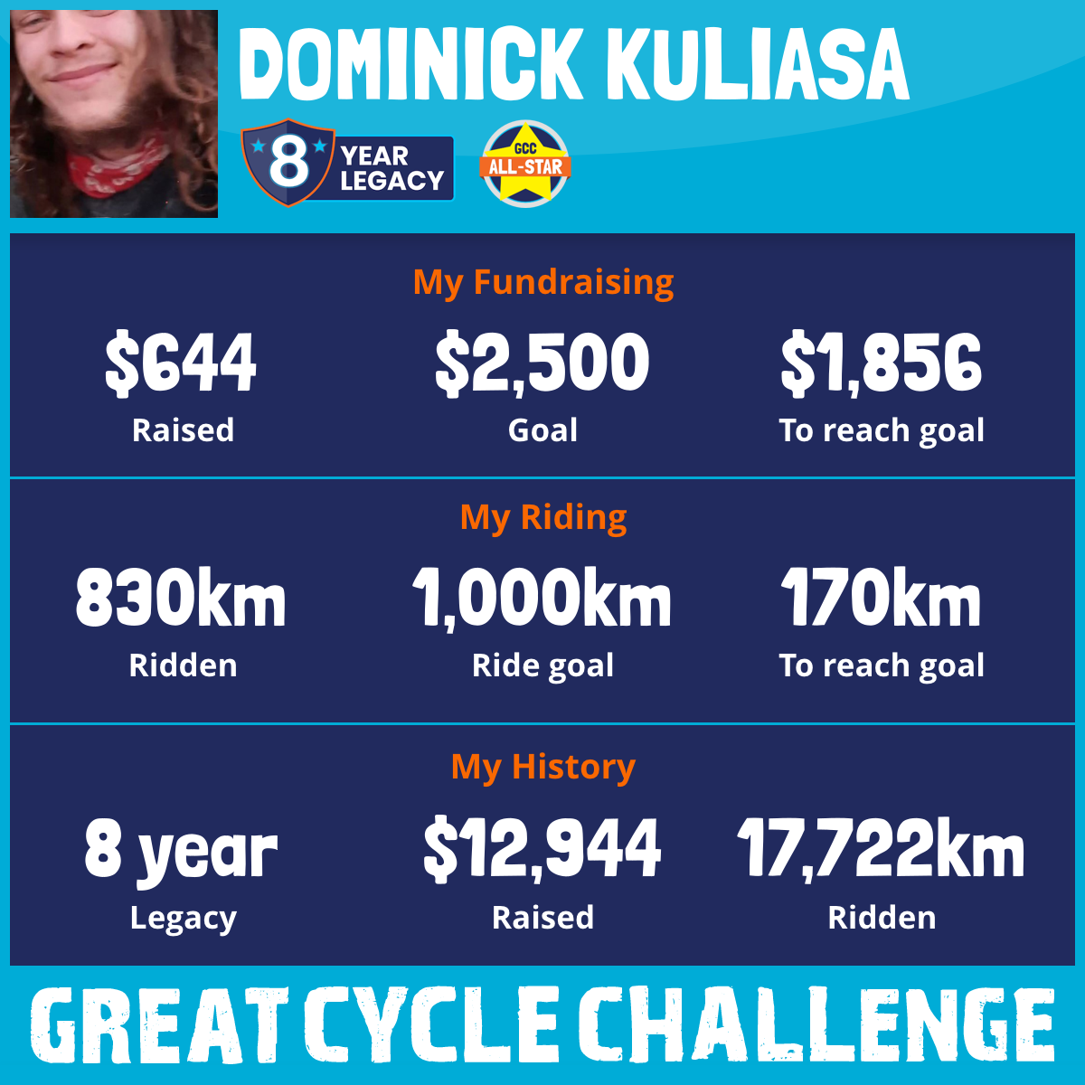3,257 km Ridden$1,164 Raised2022