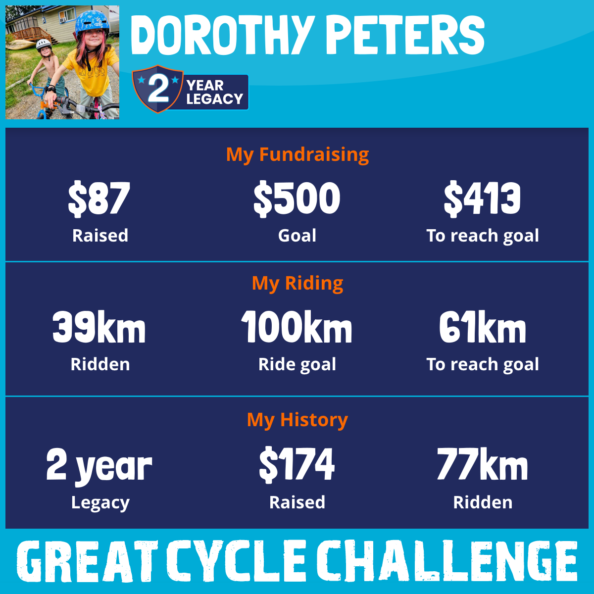 I am riding 100 km in memory of family members who have passed due to cancer and to celebrate family members who have beat cancer. Please sponsor me and support my challenge to fight kids' cancer and save little lives.
