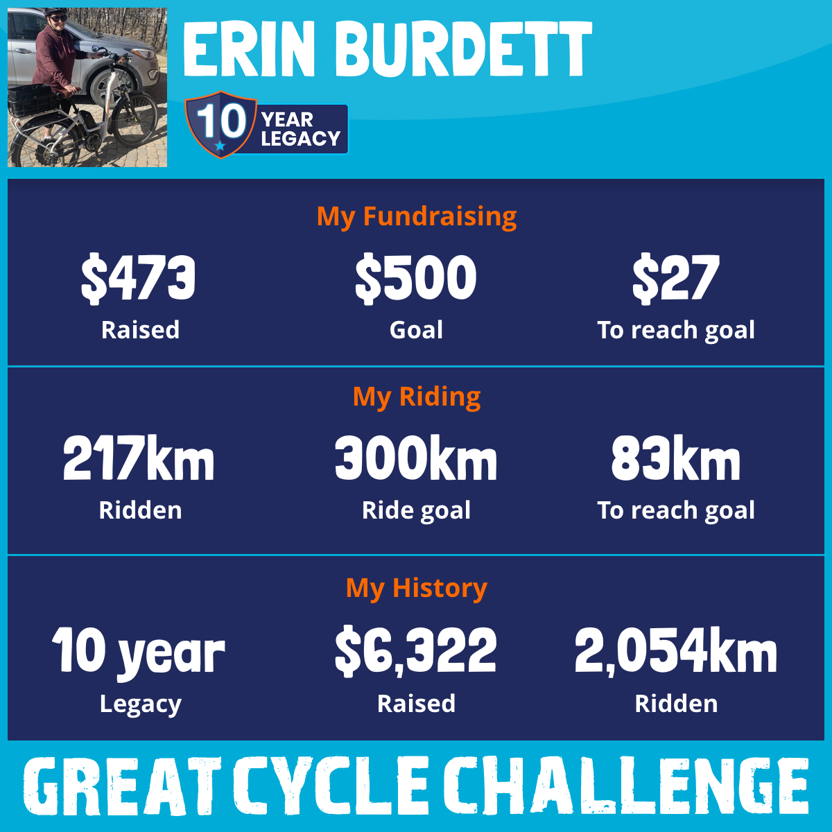 I am riding 450km in memory of my loved one, Audrey Burdett. Please sponsor me and support my challenge to fight kids' cancer and save little lives.