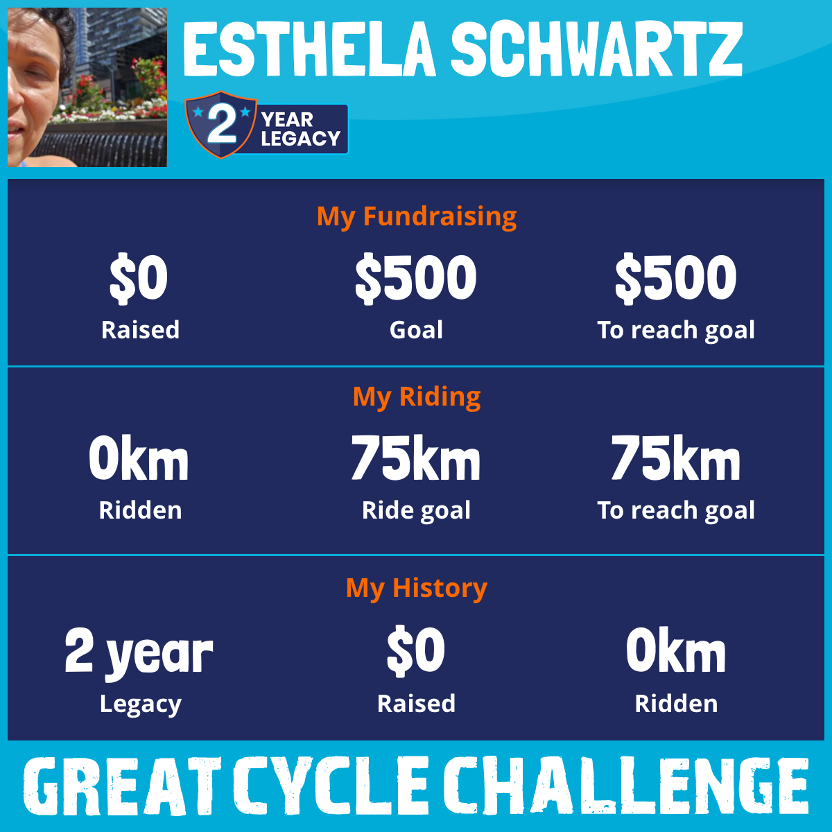 I am riding 75 km in memory of my aunty, Carolina and Elvia. Please sponsor me and support my challenge to fight kids' cancer and save little lives.