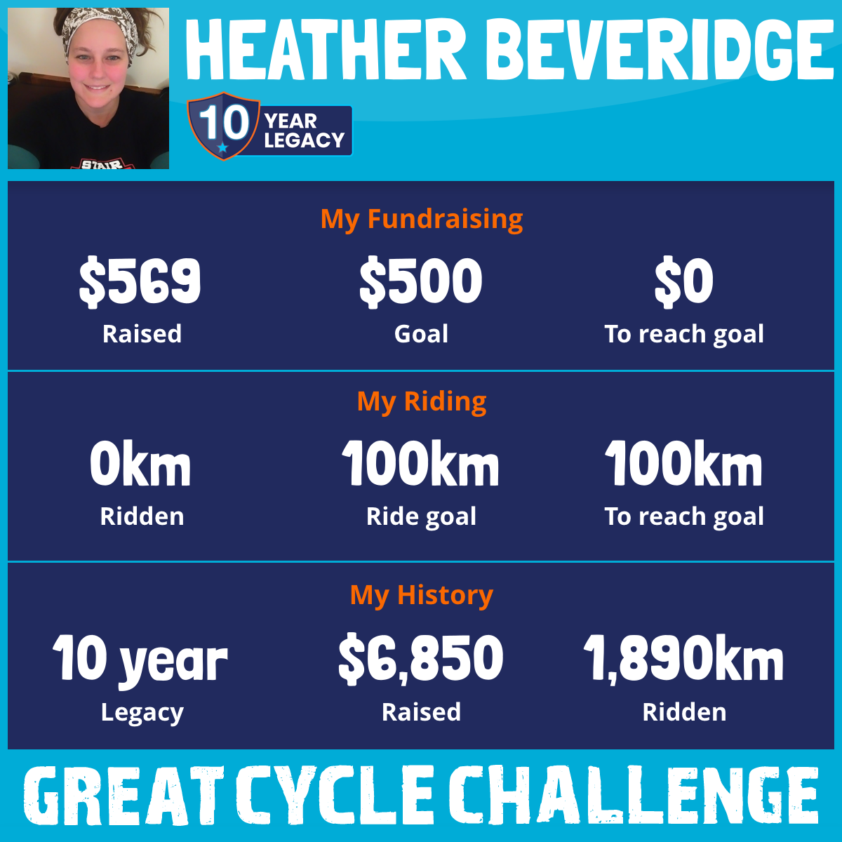 Over the last 10 years I have ridden 1746 km during the challenge and raised $6004.09. This year I will be riding again and hope you will support the cause with a donation. It's been a tough year for everyone and this with kids battling cancer have had to endure the new stress of fighting through a pandemic. I am hope to raise more than I have ever before to show those families they are not alone.