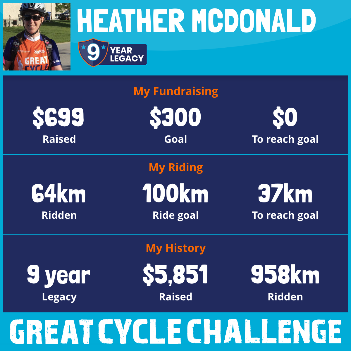 This August, I am taking part in the Great Cycle Challenge to fight kids' cancer! This will be my ninth year riding and raising funds for SickKids. Over the last 8 years I have ridden 894km and raised $5851.17 with your support! Can I count on you to help me again this year?