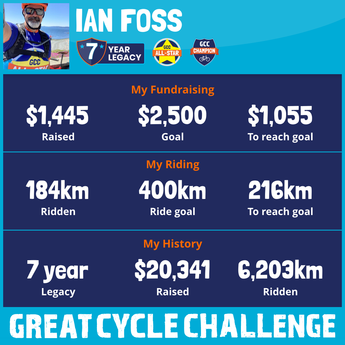 I am truly grateful to participate in the Great Cycle Challenge for the seventh year to fight kids' cancer. Over the past five years, with your support, I have raised over $19,000 while cycling over 6,000km.
