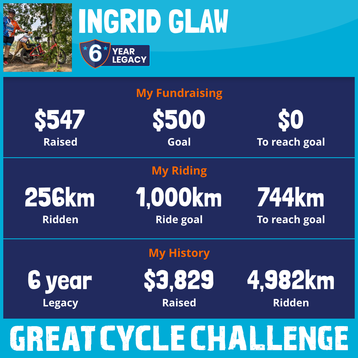This is my 5th year doing the Great Cycle Challenge. I've raise $2694 and have ridden 3724 km.