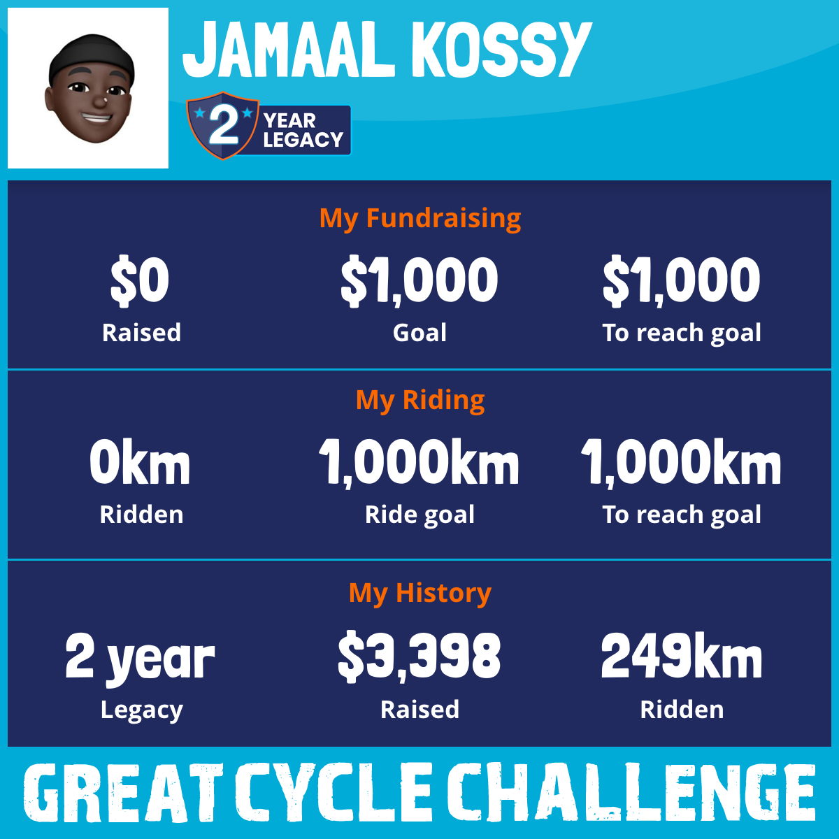 For every $1 donated, I will ride 1km. For every km I don't ride, I'll match the uncompleted distance in donations.