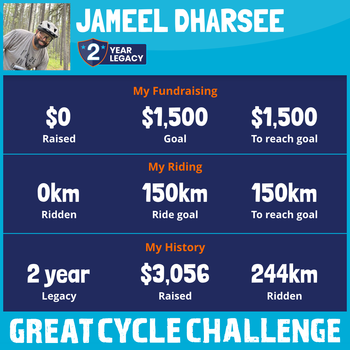 I turned 40 this past July and as such I am an old man now. In my late 20s, with my good buddy Kevin Morse, I had challenged myself in support of the Enbridge Ride to Conquer Cancer. 200+ KM journey across the foothills of the Canadian Rockies in just 2 days. With great determination and while other more experienced and fit riders tapped out during harsh winds, hail and rain, both of us successfully completed the ride with NO walking. It is with that same force I am back with even more grit and ready to ride “over the hill” and once again stand against cancer. This August I will be doing the Great Cycle Challenge to fight kids’ cancer. I pledge to ride each day rain or shine with a minimum total goal of 200km and raising at least $1500. Please help support this cause by sending me good vibes, donations or joining me for a ride.