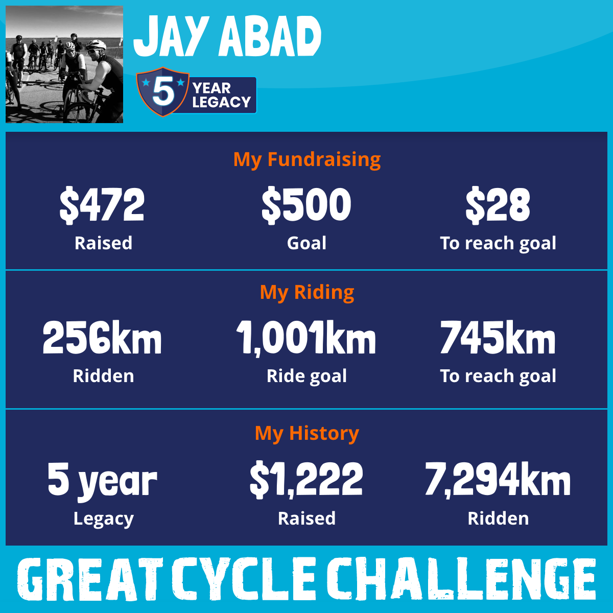 I am riding 1,001 km for Joaquin Abad. Please sponsor me and support my challenge to fight kids' cancer and save little lives.