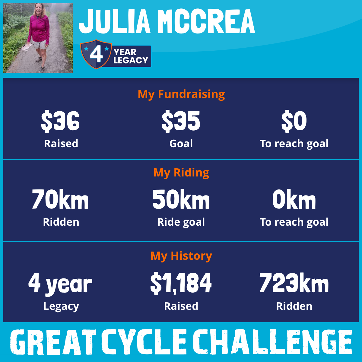 I am riding 50 km in memory of Janet, Larry, Janice, Sue, Wilma, Grace, Margaret, Dad, Jim & support Greg. Please sponsor me and support my challenge to