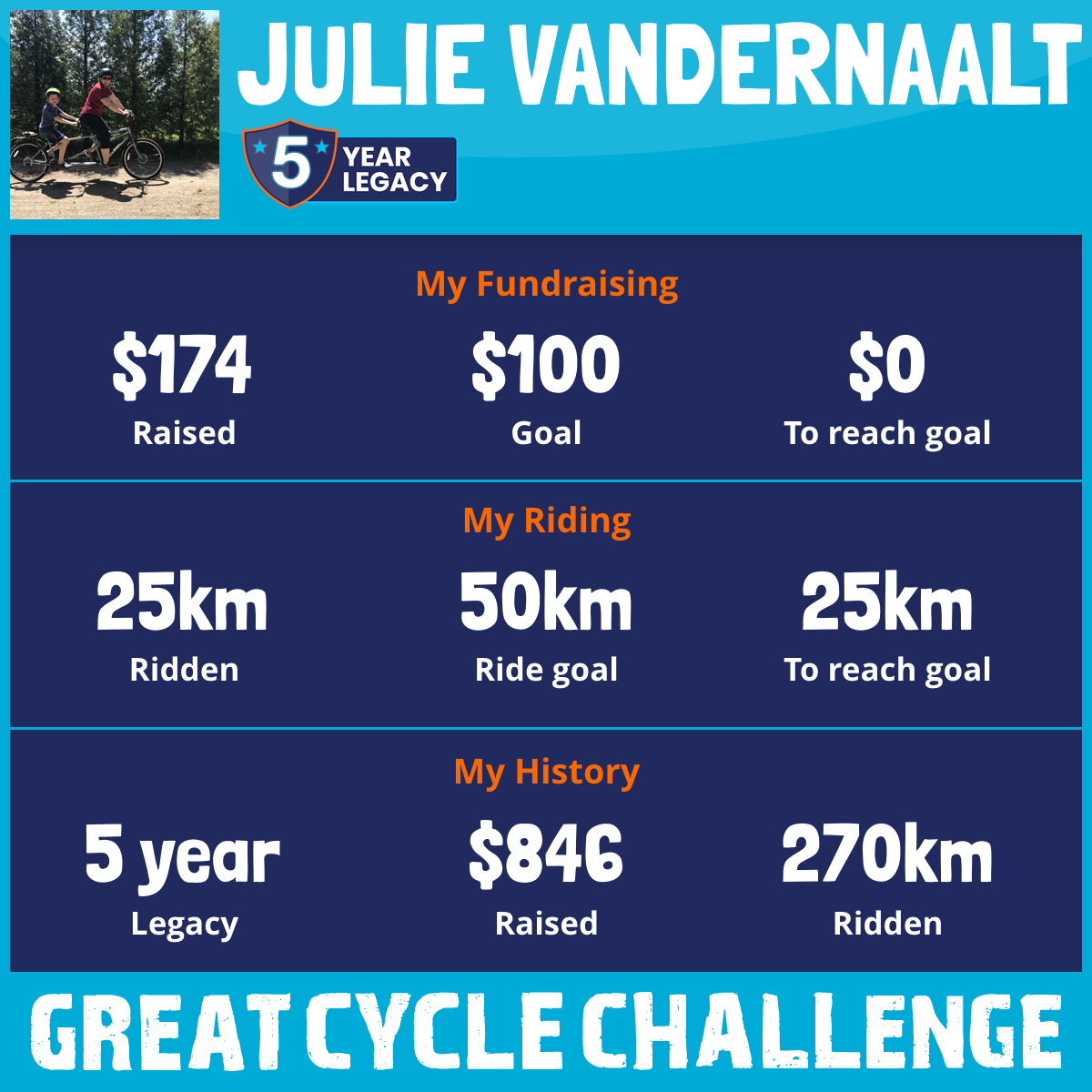 I am riding 50 km for my friend, Jodi. Please sponsor me and support my challenge to fight kids' cancer and save little lives.