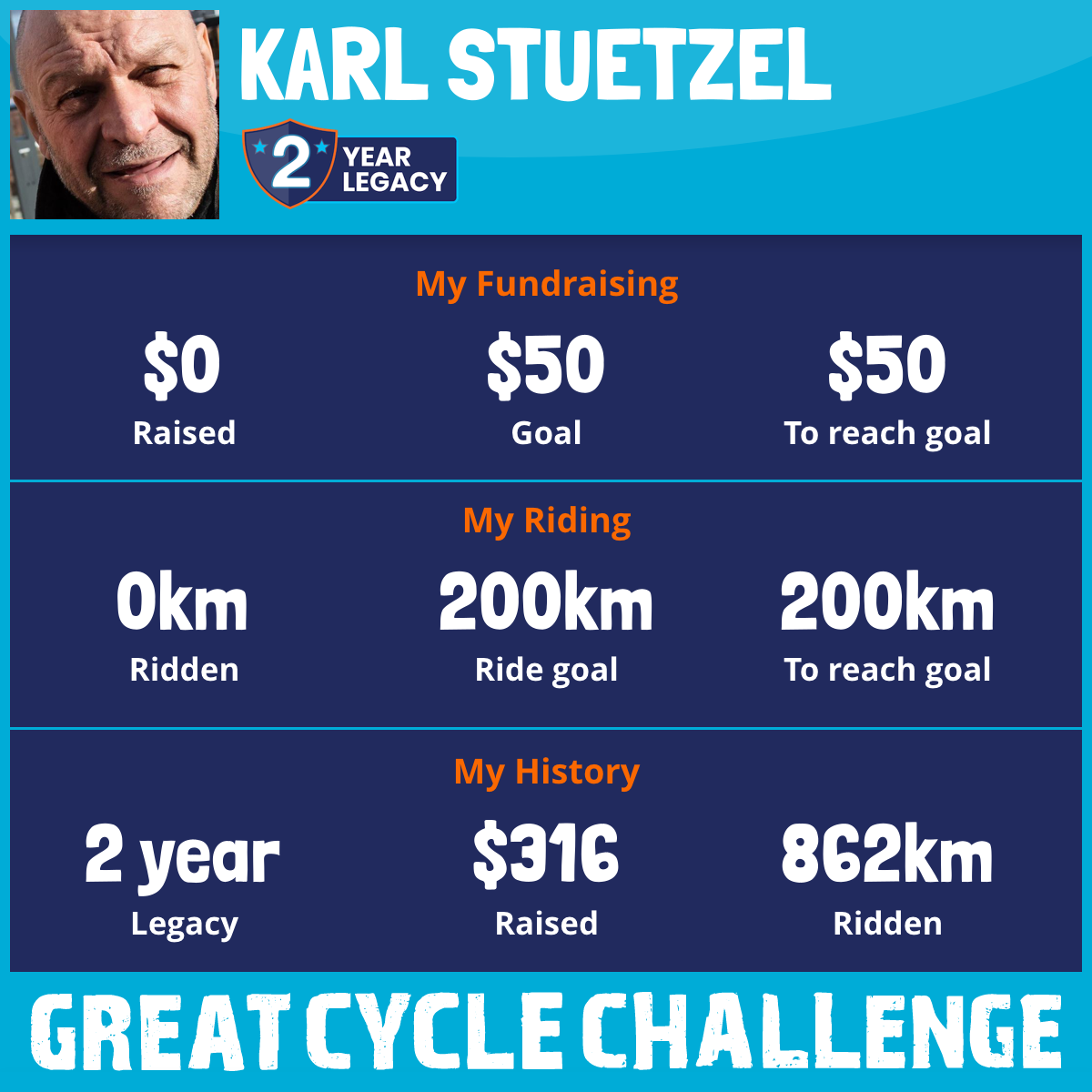 I am riding 200 km in memory of my wife, Karin Stuetzel. Please sponsor me and support my challenge to fight kids' cancer and save little lives.