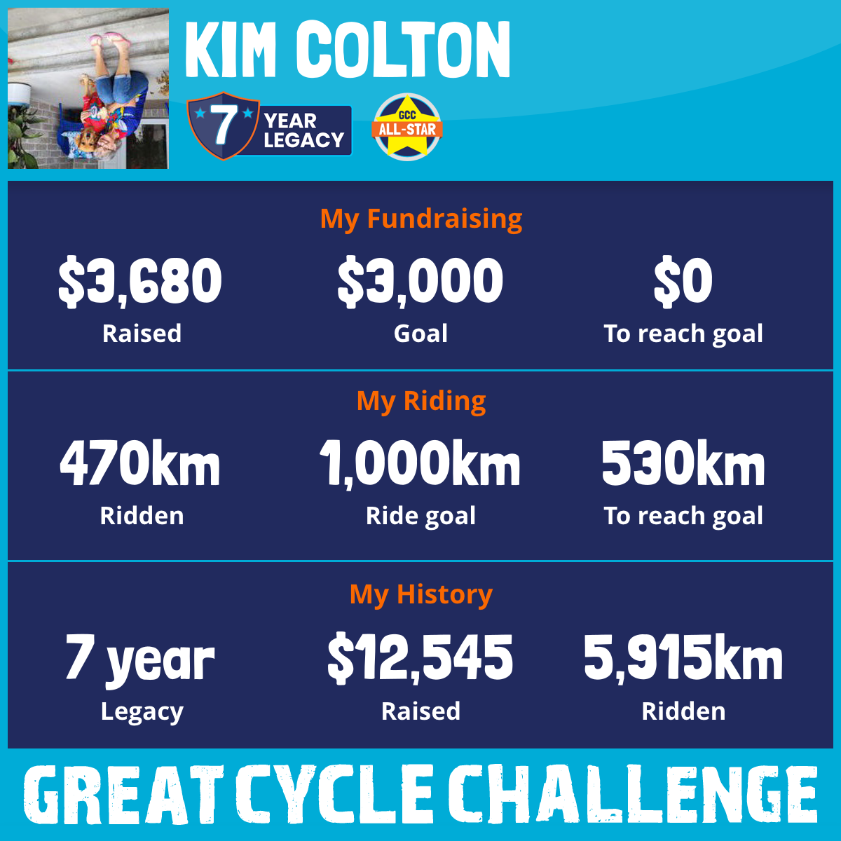 This August will be my 7th year raising funds for Kids Cancer through the Great Cycle Challenge!