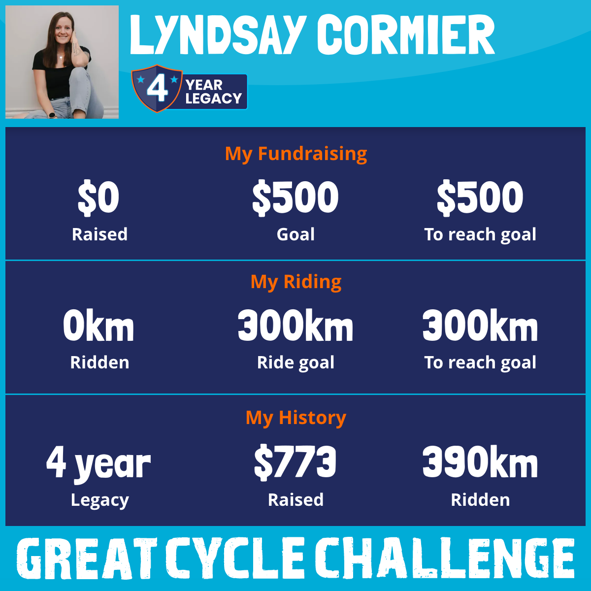 I am riding 300 km in memory of Lyndsay. Please sponsor me and support my challenge to fight kids' cancer and save little lives.