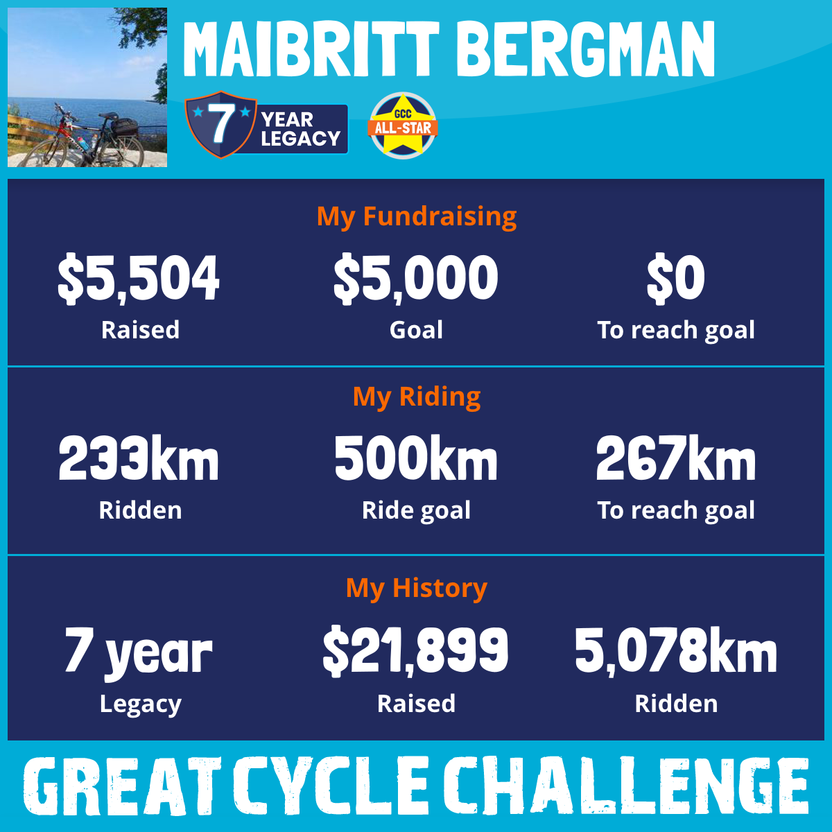This is my 7th year to ride and raise funds for the Great Cycle Challenge. Every year this challenge touches my heart as family & friends of all ages are diagnosed with cancer. I am thankful to have continued health and strength to ride and support the SickKids Foundation for more children's cancer research.