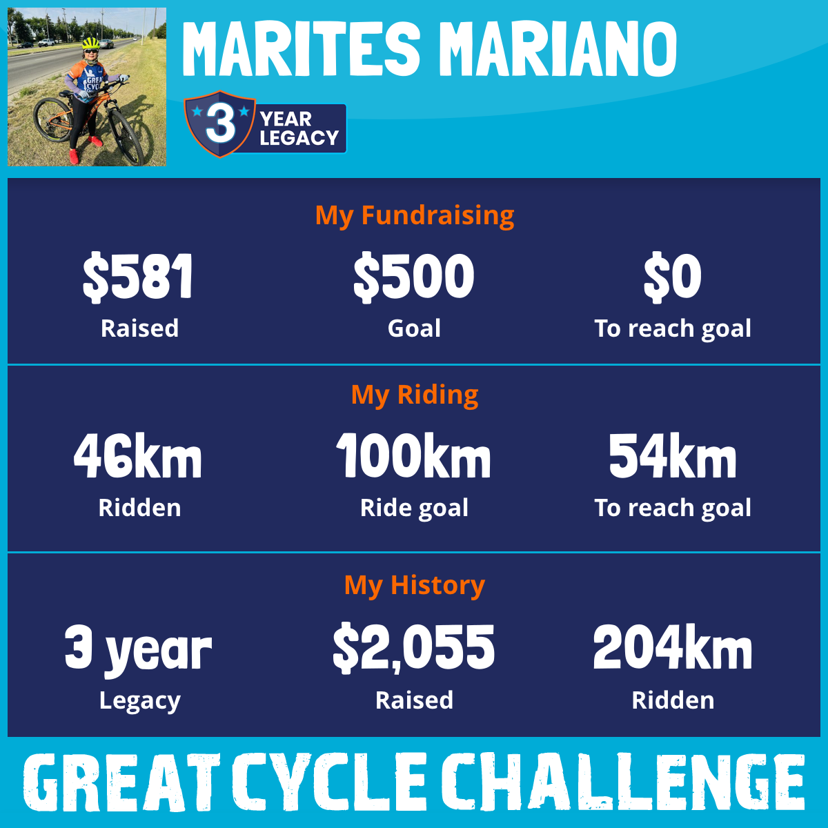 This is my 3rd year joining the Great Cycle Challenge to fight kids Cancer. I’m riding in memory of my mom and father in law who died with cancer. Please support me by making donations to help these kids to fight cancer. Thank you.