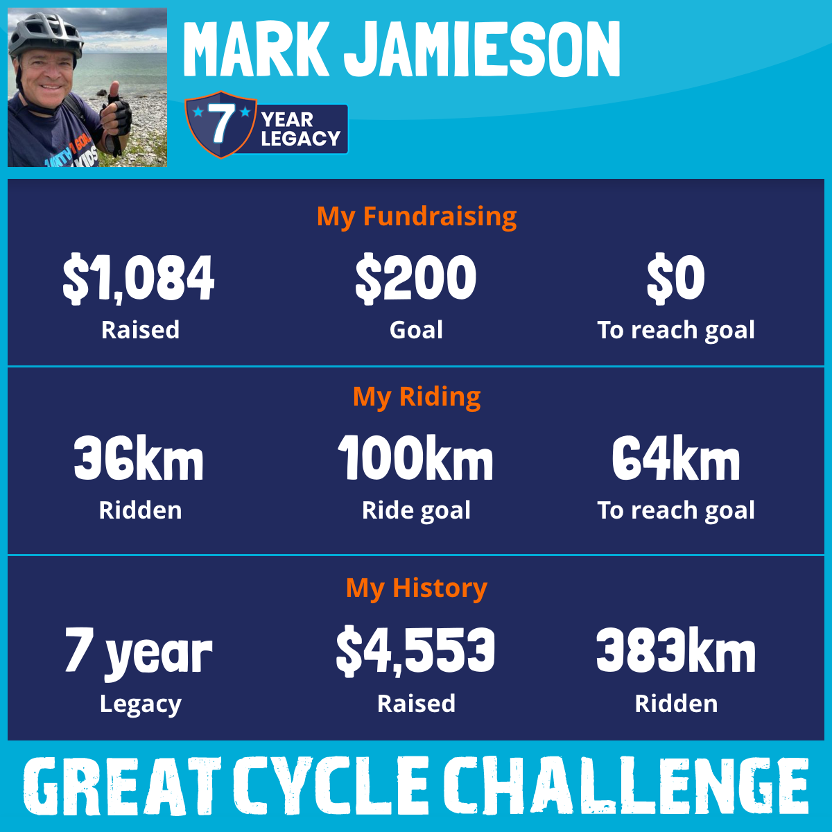 Thankyou to everyone who has supported me this summer for my GCC ride to support childhood cancer research. I sincerely appreciate everyone’s generous donations and kind words of support!! Mark Jamieson