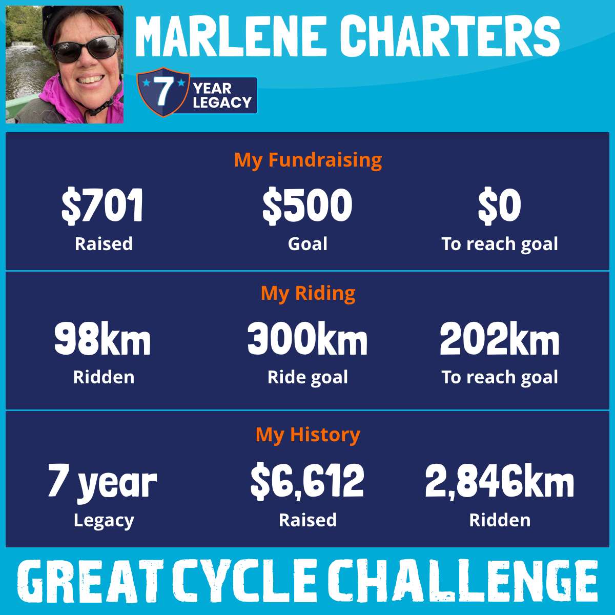 “Thankyou so much Liz for your donation and thank you too for your ongoing support of me and this challenge. I believe that you have supported me from my first year of the challenge and I THANK YOU for that. It is such a great cause. I appreciate it so much ❤️ Marlene 🚴‍♀️”