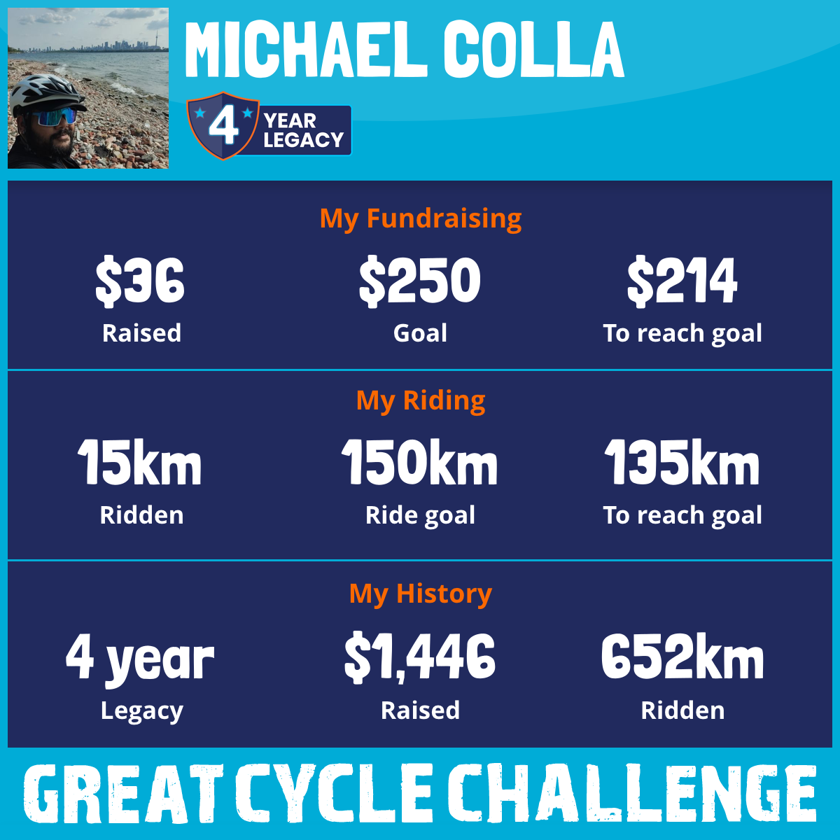 I am riding 150 km for my sister, Sheila Colla. Please sponsor me and support my challenge to fight kids' cancer and save little lives.