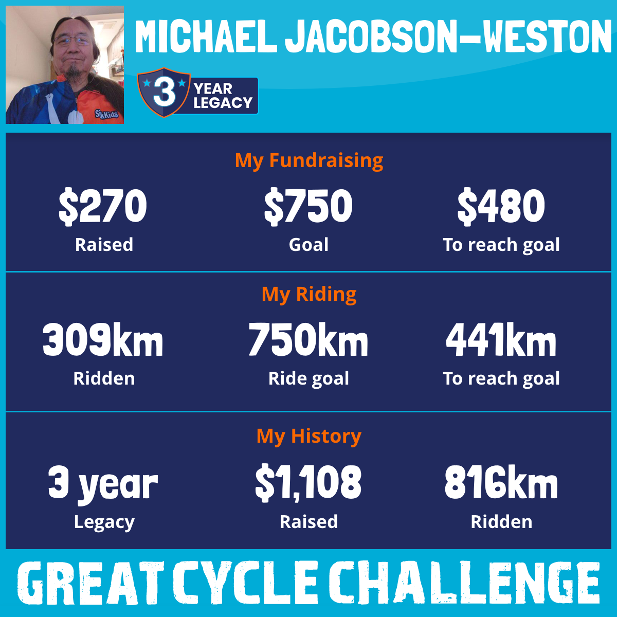 So I am raising funds through my challenge to help these kids and support SickKids Foundation to allow them to continue their work in developing treatments and finding a cure for childhood cancer.