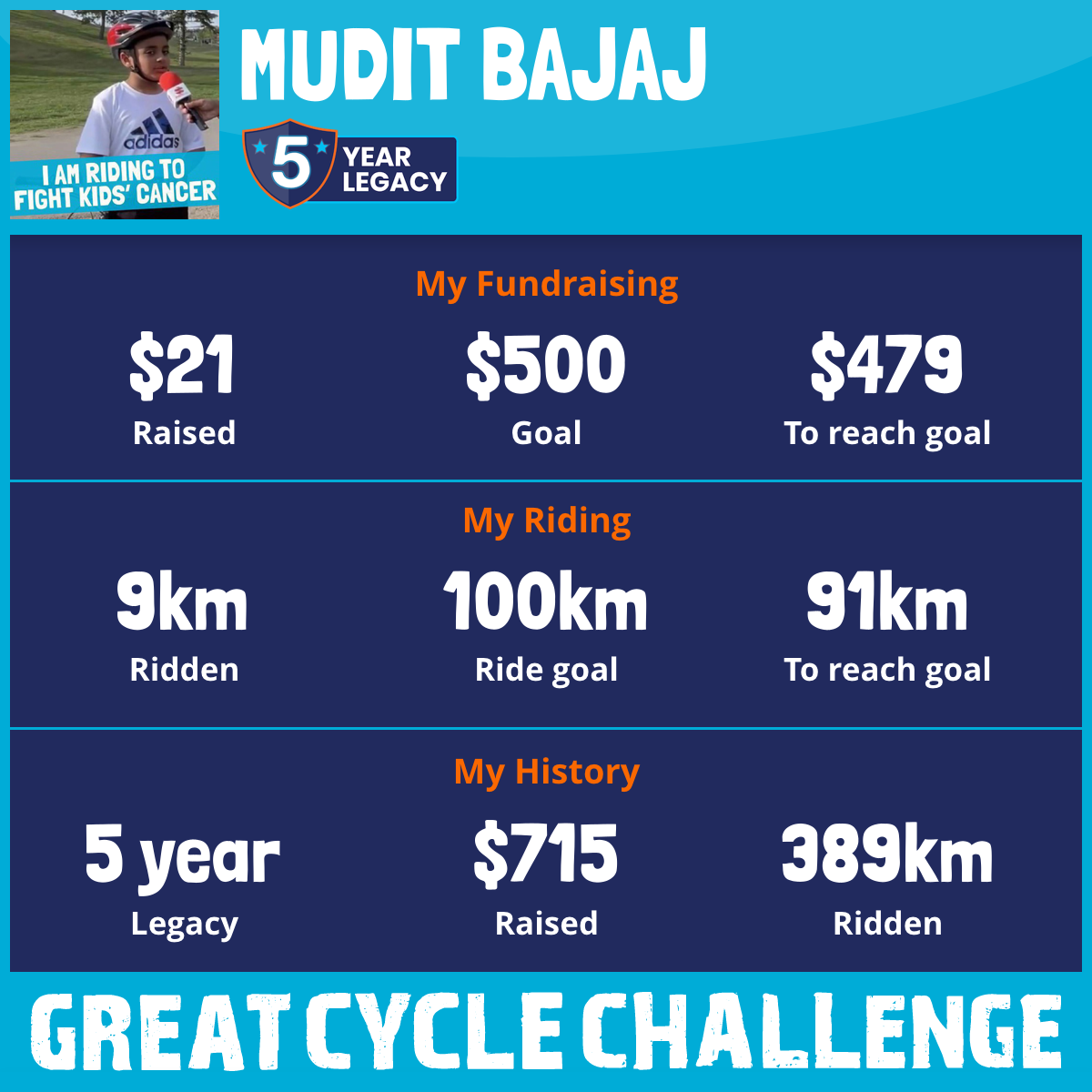Hi everyone, it’s Mudit here. This August, I am taking part in the Great Cycle Challenge to fight kids' cancer!