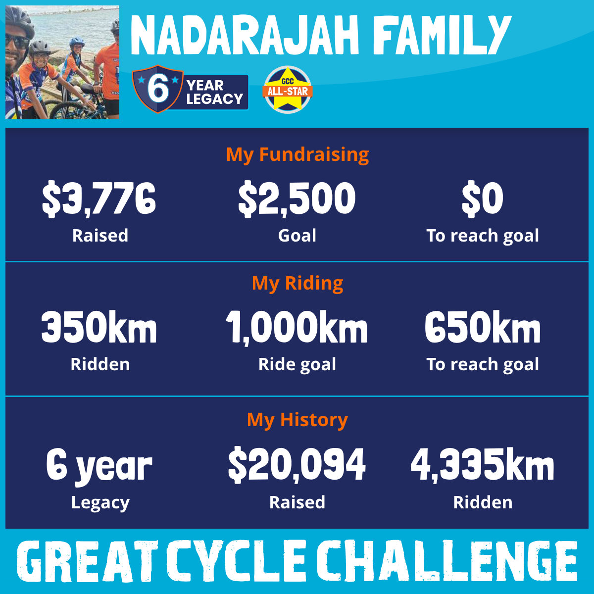 1,002 km Ridden$4,696 Raised2026