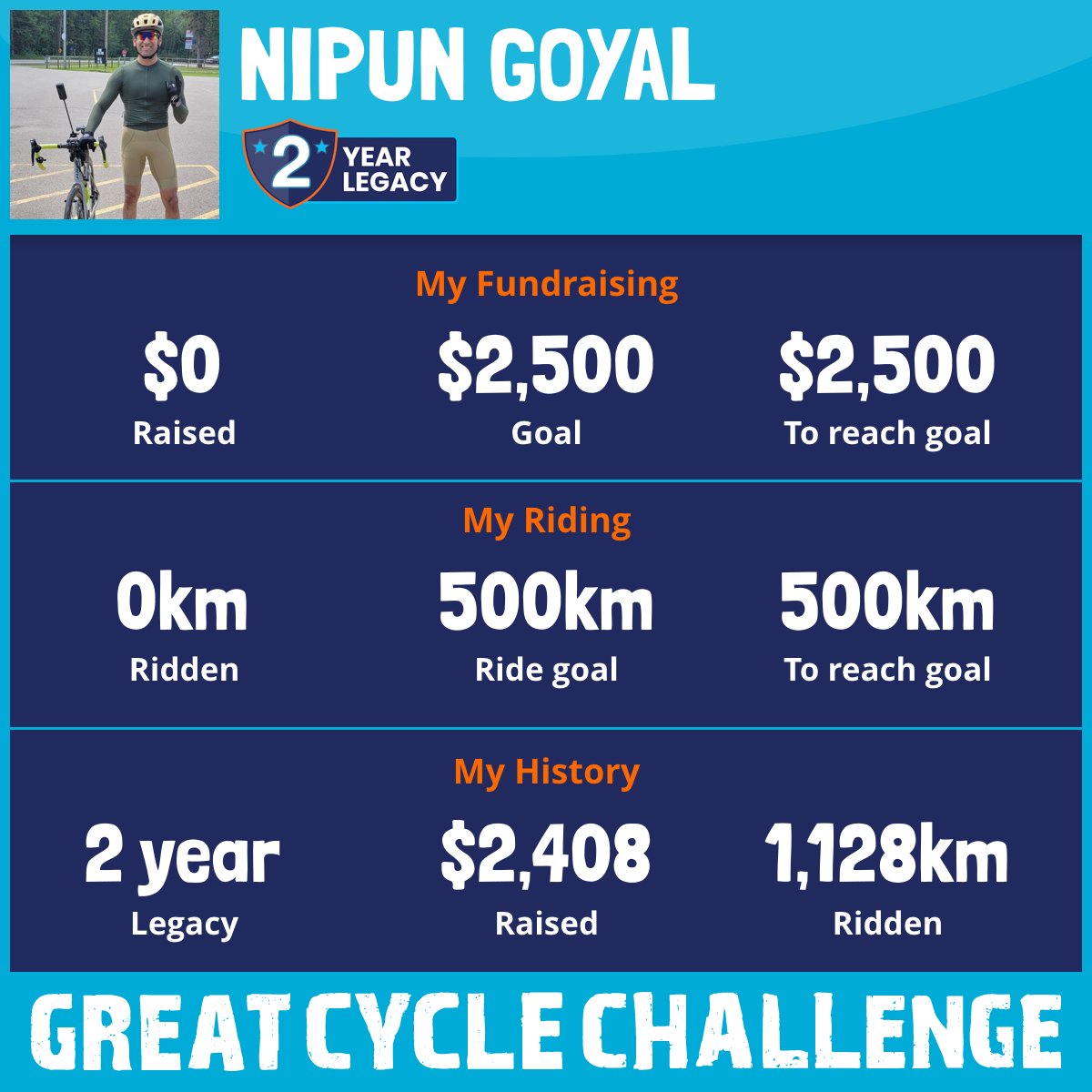 ๐. ๐๐จ๐ง๐๐ญ๐: Every dollar counts and brings us closer to a cure. Use this link to donate: https://greatcyclechallenge.ca/Riders/NipunGoyal