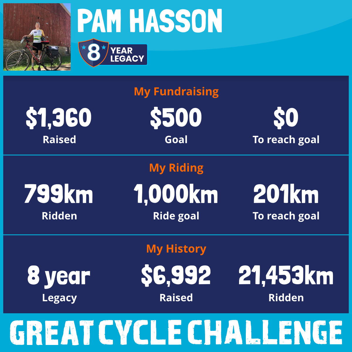 3,021 km Ridden$1,414 Raised2022