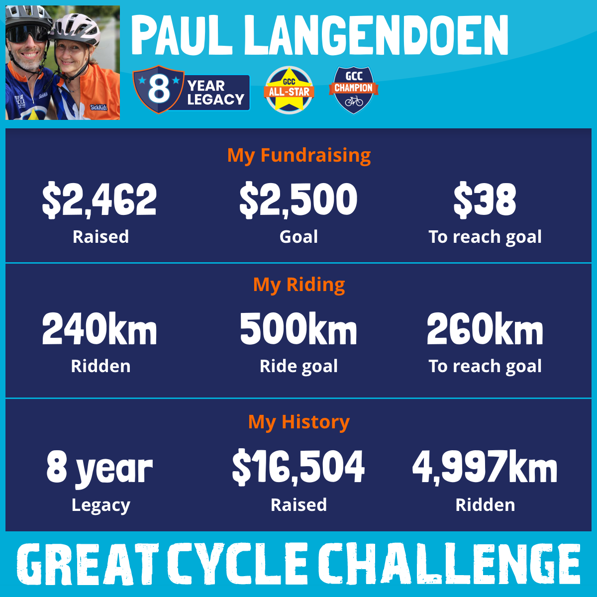 Most of us have been touched by cancer in our lives. Be it family or friends, young or old, cancer doesn't discriminate. I am doing the Great Cycle Challenge for the 6th time to help in the fight against this disease.
