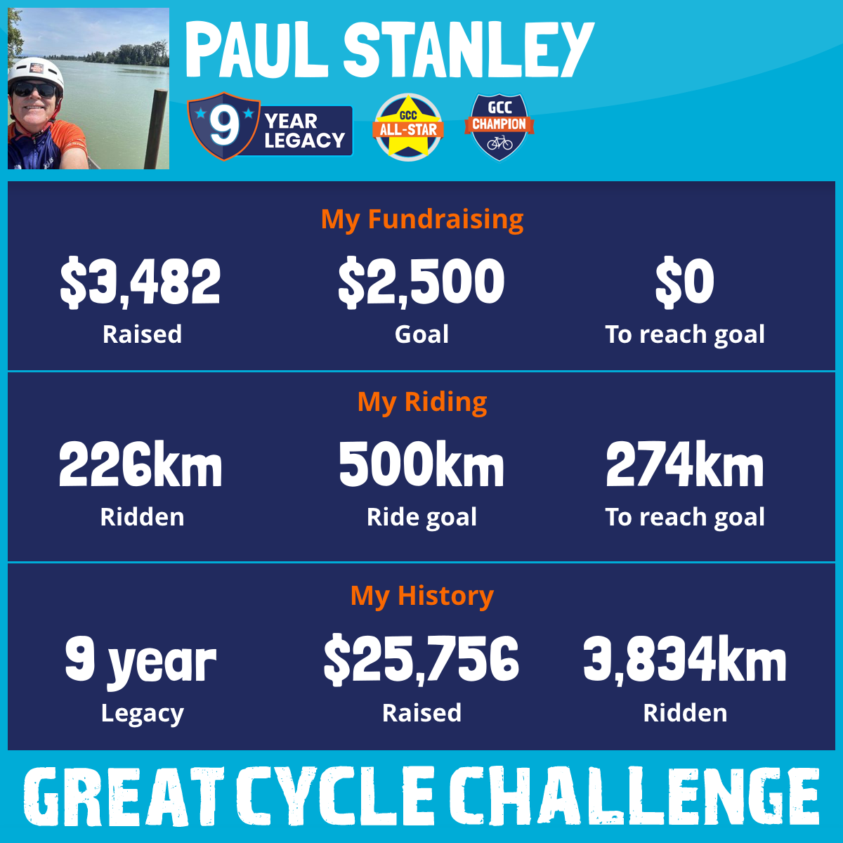 1 Sep 2025Well the ride is over for another year. This year was one of the best for donations to kick cancer's butt. I am amazed at the amount of money and support I get from friends and family. I am pleased to announce that this year's total is $4,000! OMG..... I managed to ride 593 KMs beating my goal of 500. I'm pooped, especially after the last ride of the month, 109 KMs. If you like riding a bike, you might want to sign up for next year's ride. You chose the distance you want to ride in a month using a bike, e-bike or stationary bike. And you chose your personal donation goal. I am not a cyclist. I only seem to ride in August for , just for the ride. Also, all ages of riders can participate.