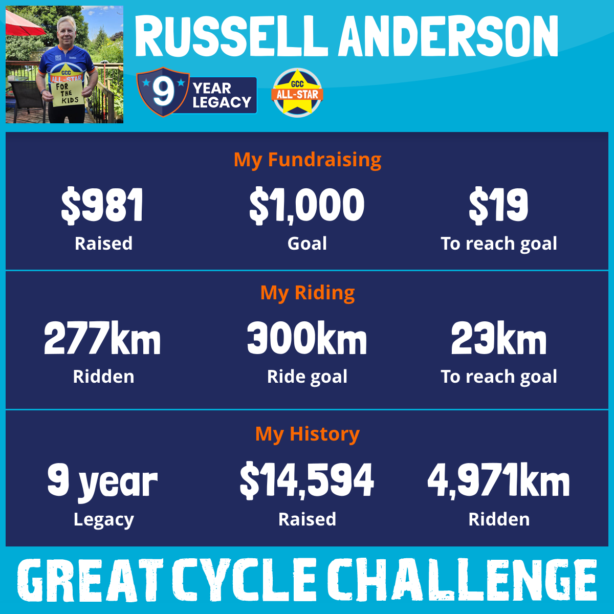 To date and something I am very proud of is that in 9 years I have bicycled over 5100 km in the month of August and help raise over $14000 dollars for the SickKids Foundation!
