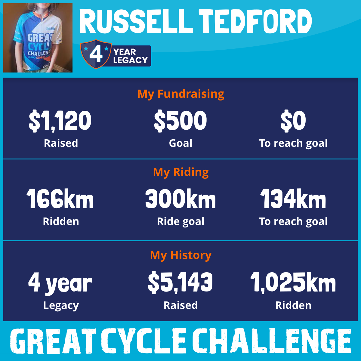 I am riding 300 km for My Poppa. Please sponsor me and support my challenge to fight kids' cancer and save little lives.